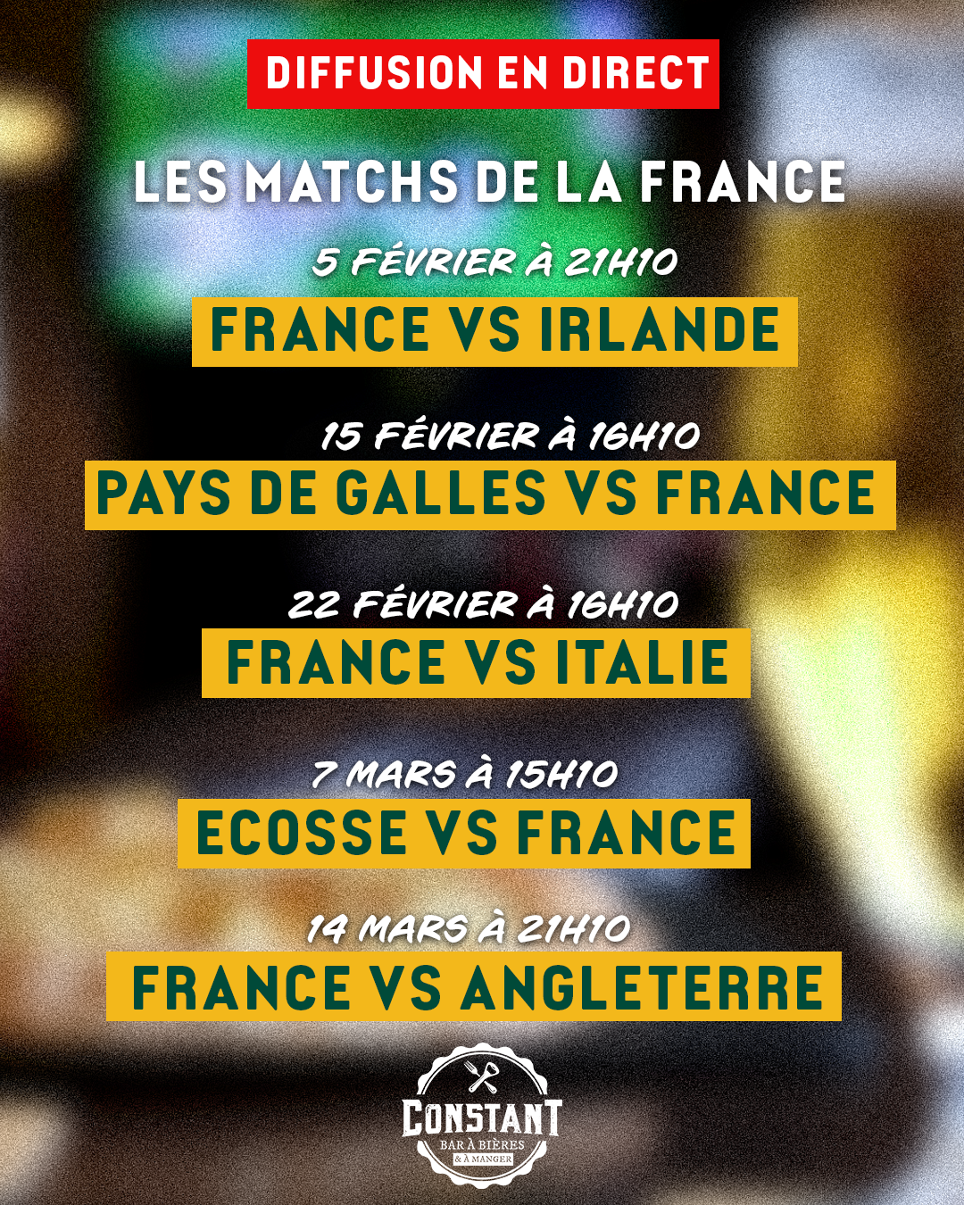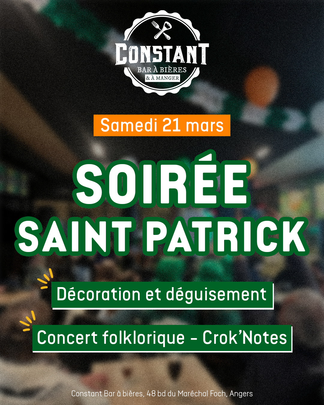 Inspiré par l’univers des pubs anglophones, la franchise Constant bar à bières & à manger propose un lieu chaleureux où l’on se retrouve entre amis, en famille ou entre collègues. L’ambiance y est conviviale, rythmée par une large sélection de bières, une offre food généreuse, et des soirées animées : DJ sets, concerts live, retransmissions sportives et soirées à thèmes.